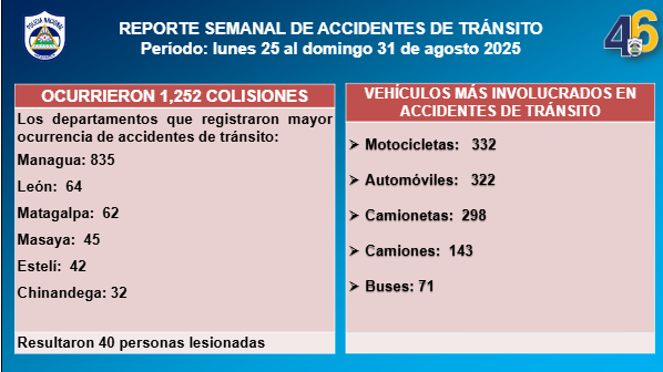 En la semana comprendida del lunes 25 al domingo 31 de agosto del 2025 se registraron 1,252 colisiones, siendo los departamentos de Managua, León y Matagalpa los más afectados, resultando 40 personas lesionadas.