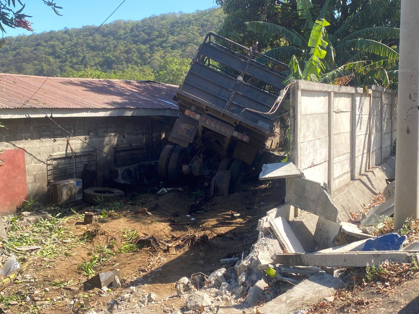 Antes de salirse de la vía y detenerse el camión con placas M 343 301, se estrelló contra un muro perimetral y paredes de una vivienda que funciona como oficinas de la empresa CONCRENIC.