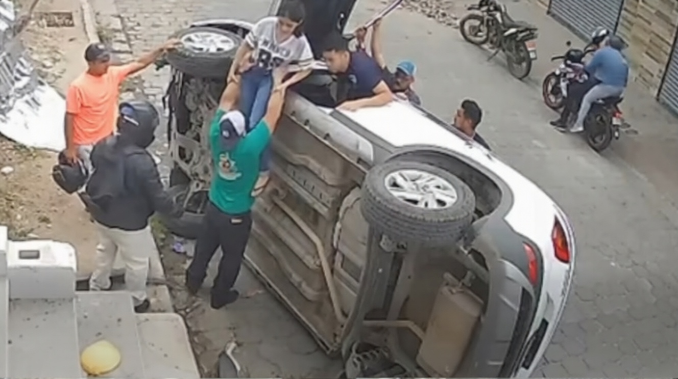 Testigos presenciales, incluyendo trabajadores de una ferretería local y otros conductores, brindaron auxilio inmediato a los ocupantes y colaboraron para enderezar el vehículo.